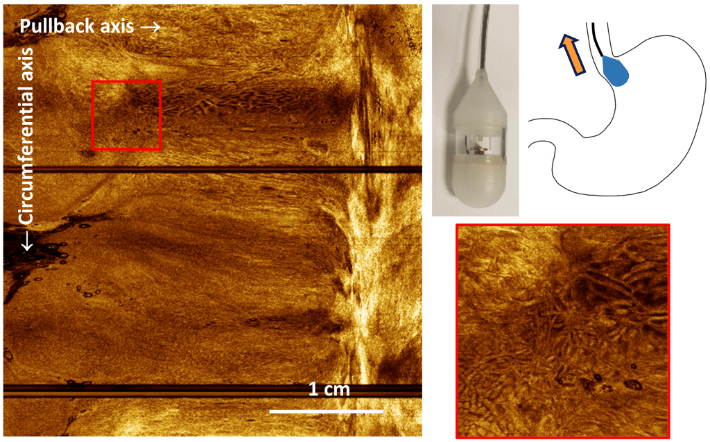 Endoscopy is complex and requires anesthesia. Diagnosis requires microscopic assessment of the organ surface. Ultrafast Optical Coherence Tomography at millions of axial scans/sec, combined with a micromotor scanning tethered capsule, delivers gigantic fields-of-view in the human esophagus without needing anesthesia.